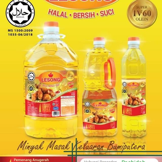 Minyak masak lesong 5kg, 2l dan 1l kualiti premium iv60 dan 5 kali tapisan boleh digunakan sehingga 5 ke 7 kali gorengan minyak kekal jernih selepas . Senarai minyak masak buatan bumiputera.